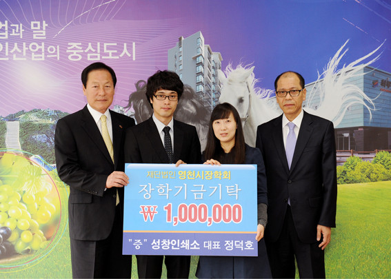 성창인쇄소 정덕호 대표는 “영천 시민으로서 영천발전을 위해 할 수 있는 일을 찾다 장학회 소식을 접하고 지역인재들을 위해 기탁하기로 결심했다. 적은 금액이지만 지역학생들이 마음껏 공부할 수 있는 환경을 만드는데 도움이 되길 바란다.”고 전했다.