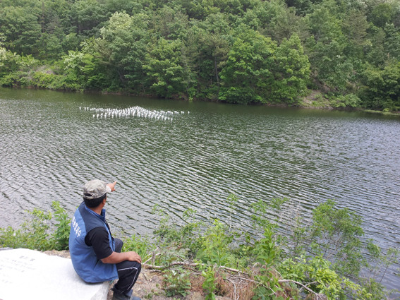 ↑↑ 모선재 저수지에 설치된 작품을 설명하는 권효락 새마을지도자.