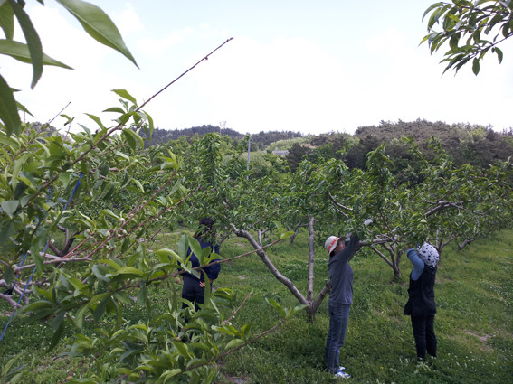↑↑ 마을주민들이 복숭아밭에서 열매솎기를 하고 있다.