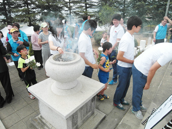 제57주년 현충일을 맞아 학생들과 시민들이 마현산 충혼탑에서 열린 추념식에 참여해 헌화분향하고 있다. 올 현충일에는 어느때보다 많은 시민들이 참석해 호국영령들의 높은 뜻을 기렸다.