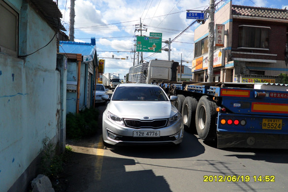 문제는 삼거리 내하천 다리가 좁아 대형트럭이 좌우회전을 원만히 할 수가 없어 차량은 차량대로 애로가 많고 보행자는 사고위험에 노출되어 있다.