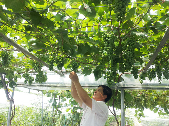 ↑↑ 포도알을 솎아주고 있는 조성현 이장.