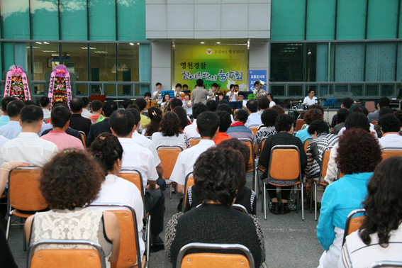 영천경찰서(서장 이근영)는 20일 경찰서 마당에서 지역주민과 경찰협력단체원, 경찰관 및 가족 등 200여명이 참석한 가운데 영천경찰서 한여름 밤의 음악회를 개최하였다.