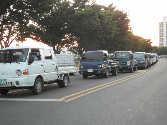 8월 복숭아 철을 맞아 망정동 과일 도매시장에는 밤낮을 가리지 않고 밀려드는 복숭아 차량들로 북적거린다. 지난 8일 오후 7시경부터 다음날 경매를 위해 복숭아를 실은 트럭들이 도매시장 도로변에 줄을 서 차례를 기다리고 있다.