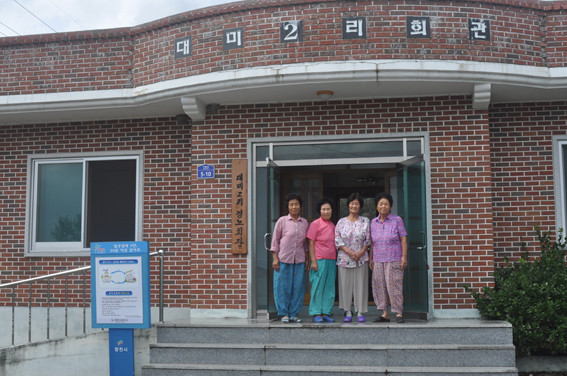 마을회관 입구에서 어르신들이 기념촬영을 하고 있다.