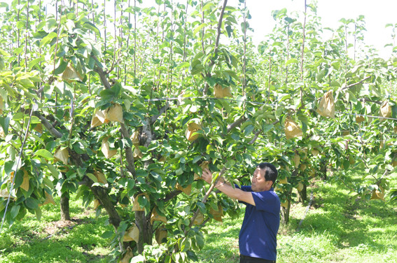 ↑↑ 박타곤 이장이 과수원에서 배나무를 손질하고 있다.