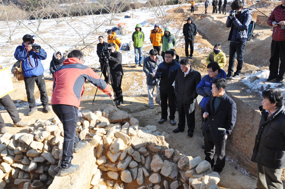 ↑↑ 계림문화재연구원 관계자가 발굴된 유물을 설명하고 있다.