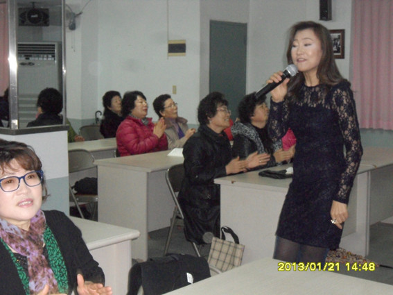 주민들을 상대로 약간의 가입비만 받고 지난 7일부터 매주 월요일 3개월 과정으로 인기가요 40여곡을 장유정 강사가 1시간동안에 걸쳐 신나는 율동과 유머 재취로 참가인 50여명을 즐겁게 하였다.