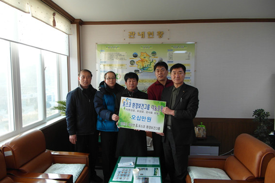 (주)포스코 환경보건그룹(리더 김헌덕)은 지난달 30일 자매결연기관인 자양면을 방문하여 어려운 이웃을 위해 써달라며 성금 50만원을 기탁하였다.