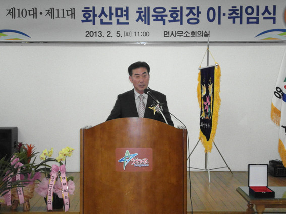화산면 체육회장 이 취임식이 지난 5일 오전 화산면 사무소 2층 회의실에서 손문식 화산면장, 정낙온 시의원, 권용재 시 체육회 사무국장, 한혁동 금호읍 체육회장과 윤만호 전 화산면 체육회장 및 역대 회장단, 회원 등 1백여 명이 참석한 가운데 열렸다.