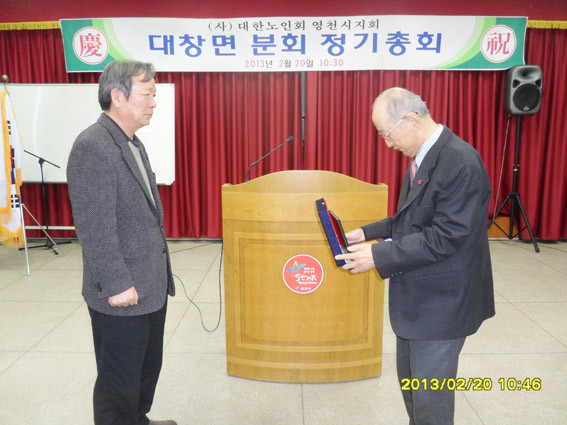 이날 총회에서 신명금속 주학지 대표가 그동안 대창노인회 공경에 최고의 공로자로 감사패를 받고 대재리 박호석(91) 할아버지에게 공로패가 주어졌다.