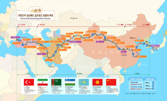 | | | ↑↑ 실크로드 탐험 전체 구간… 경북도 실크로드 탐험대(총 탐험길이 1만6511㎞)는 1차 경주∼시안, 2차 시안∼이스탄불 구간으로 나눠 실크로드 주요 도시를 탐험한다. | | ⓒ 영천시민뉴스 | | 경북도는 신라문화를 재조명하고 경북을 세계에 알리기 위해 역사적인 '경주∼이스탄불 실크로드 대탐험'을 실시, 현지에서 이스탄불-경주세계문화엑스포에 대한 홍보활동을 활발히 벌인다.