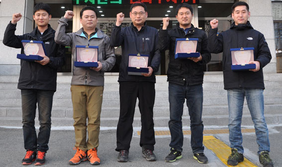 ↑↑ 이기락 팀장(가운데)과 대원들이 화이팅을 외치고 있다.