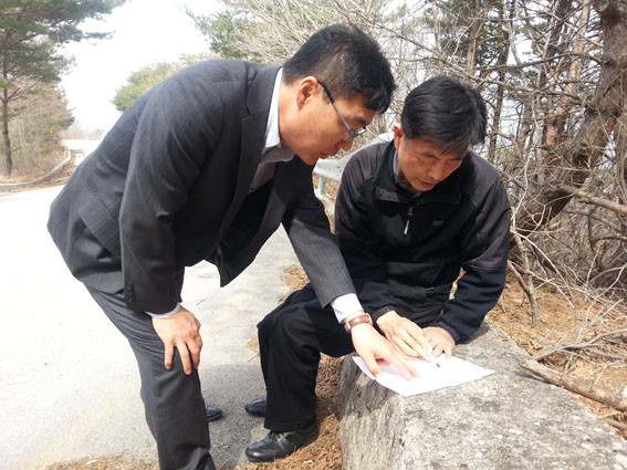 답사팀에는 최병식(사진 우측) 경계탐사대 선발대장과 최상국(좌측) 영천시청 담당자가 참여했다. 이들은 버스운행 및 진입로, 산행시 안전문제 등을 관찰했다. 본 탐사대는 4월 13일 군위군 대율리로 들어가 팔공산 비로봉, 신녕면 치산을 내려오면서 경계 지역을 탐사한다.