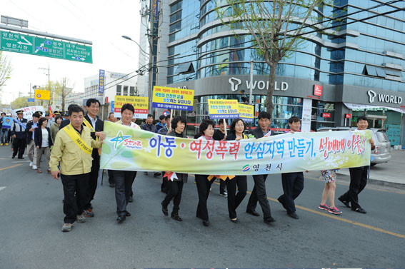 4대 사회악을 근절하기 위해 지역의 각 단체에서 발 벗고 나섰다. 영천경찰서와 영천시를 비롯한 각 기관단체들은 지난 16일 시내일원에서 4대 사회악 근절 범시민 결의대회 및 시가행진 캠페인을 전개했다. 사진은 국민은행 오거리에서 가두행진을 펼치고 있는 영천시청 직원 모습.