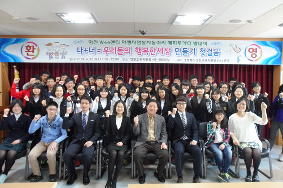 영천교육지원청 Wee센터는 지난달 13일 교육청 4층 대회의실에서 학생자원 동아리 ‘해피투게더(행복한 세상 만들기)’ 발대식을 개최했다. ‘해피투게더’는 영천 Wee센터가 관내 중고생을 대상으로 자발적이고 지속적인 봉사활동을 함으로써 자원봉사의 진정한 의미를 깨달을 수 있는 기회를 제공하는 프로그램이다.