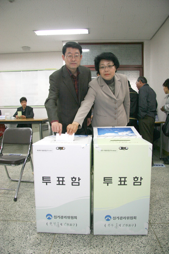 제18대 국회의원 선거 당선자인 정희수 국회의원 부부가 선거당일인 지난 9일 오전 8시30분경 동부동 5투표소인 망정주공아파트 관리실에서 투표에 참여했다.