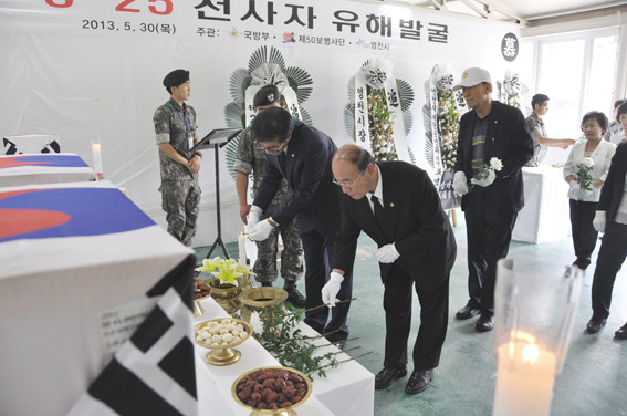 6월은 호국보훈의 달이다. 지역마다 6월이 되면 나라와 국민을 위해 숭고한 목숨을 바친 호국영령들을 참배하고 있다. 특히 영천은 다른 지역보다 가슴 뜨거운 6월을 맞이하고 있다. 6·25전쟁 당시 대한민국이 최대의 위기에 몰렸을 때 마지막 교두보역할을 하면서 수많은 젊은 용사들이 피로 지킨 곳이기 때문이다. 이런 아픔 속에 국방부와 50사단, 영천시는 이름도 얼굴도 모르지만 영천의 산야에 고이 묻혀있는 호국용사들을 가족과 조국의 품으로 보내기 위해 발굴작업을 하고 있다. 사진은 영천 안보단체협의회가 50사단 영천대대에 마련된 임시봉안소에서 지금까지 발굴된 호국용사들에게 참배하고 있는 모습이다.