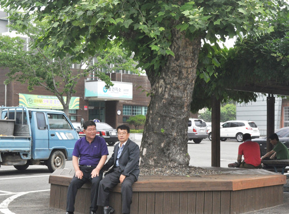 ↑↑ 고경면사무소 앞 쉼터에서 이야기하고 있는 서원교 부면장(우)과 정태현 이장(좌).