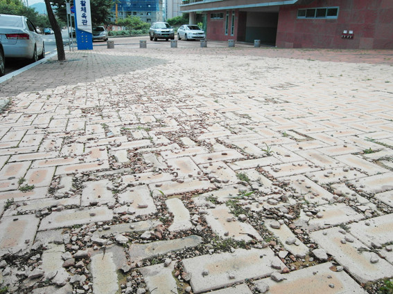 보기흉한 인도블럭 시민운동장 입구 생활체육관 앞 인도블럭의 파손된 조각이 흉하게 보인다. 생활체육관은 처음부터 부실시공으로 말썽이 있었는데, 사람이 가장 많이 다니는 인도까지 부실 영향이 미쳐 깨끗한 체육시설 이미지를 훼손하고 있다. 황토색 블록이 깔린 곳은 모두 이런 현상이 나타나고 있다.