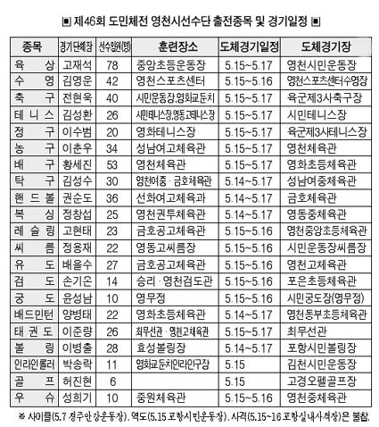 영천시체육회(회장 김영석 시장)는 시부24개 종목 가운데 21개 종목(사이클, 역도, 사격 불참)에 선수 5백 명(남3백35명, 여1백65명) 임원 1백55명 등 역대 최대 규모인 6백55명이 출전한다.