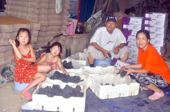 ↑↑ 서영복 할아버지(80)와 외지에 나간 이웃집 손녀들이 포도선별작업을 하고 있다.