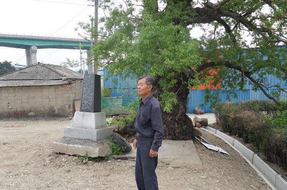 ↑↑ 김진하 전 노인회장이 마을앞 고목을 설명하고 있다.