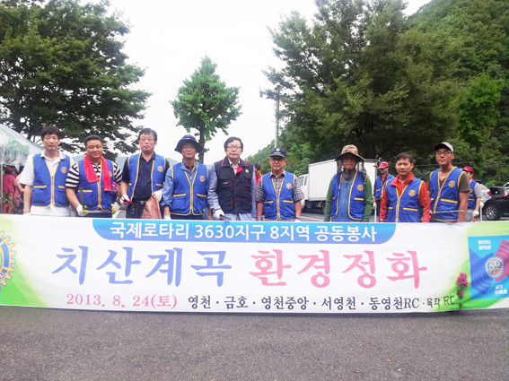 국제로타리 3630지구 8지역(대표 박금순) 6개클럽은 지난 24일 신녕면 치산계곡 환경정화 사업을 실시했다. 서영천로타리클럽에서 매년 해오던 환경정화 행사를 올해는 6개 클럽의 모든 회원들이 동참하여 비가 오는 궂은 날씨에도 불구하고, 휴가철 행락객이 많은 치산계곡의 보다 쾌적한 환경 조성을 위해 회원 모두가 환경정화에 구슬땀을 흘렸다.