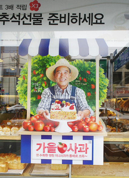 파리바게뜨는 가을시즌 상품으로 영천에서 재배한 미니사과를 통째로 올린 ‘가을사과 요거트 케이크’를 출시했다. 그리고 ‘가을사과 요거트 케이크’의 청정함과 자연친화적인 이미지를 홍보하기 위해 미니사과를 직접 재배하고 있는 농부 최병혁 씨를 모델로 선정했다.