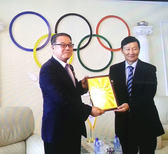 ↑↑ 최경용 회장(좌)이 몽골 IOC위원장(우)에게 훈장을 받는 모습.