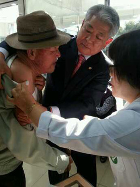 이창식 의원(사진 중앙)이 독감예방접종 자원봉사에 나서 주민들로부터 칭송을 받았다. 이 의원은 지난 14일부터 3일 동안 금호보건진료소을 찾아 거동이 불편한 어르신의 팔소매를 대신 올려주었다.
