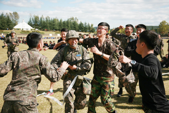 ↑↑ 군장마라톤 20km대회에서 한 생도가 결승 테이프를 통과하며 포효하고 있다.