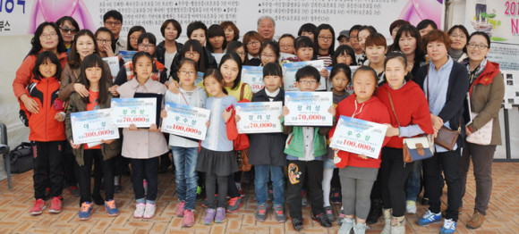 2개월에 걸쳐 열린 2013 NIE신문 신문일기 공모전이 대단원의 막을 내렸다. 이번 대회는 예전보다 훨씬 많은 246개 작품이 응모해 심사에 많은 시간이 걸리기도 했다. 3년 연속 응모한 참가자, 형제간 동반 참가자 등 사연도 다양했다. 사진은 지난달 26일 박람회장에 마련된 시민신문사 부스에서 열린시상식에서 수상자와 가족이 즐거워하고 있는 모습.