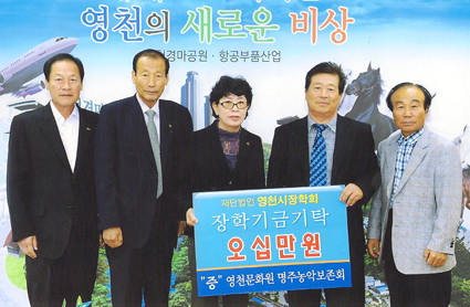명주농악보존회는 지난달 1일 안동시 탈춤공원에서 열린 제21회 경상북도 풍물경연대회에서 차상(2위)을 수상해 우리지역의 전통풍물인 명주농악의 우수성을 널리 알렸다. 박재천 회장(좌측에서 네번째)은 “그 동안 여러가지 힘든 과정을 극복하고 수상한 상금을 의미 있는 곳에 사용하자는 데 회원들이 뜻을 같이 하여 적은 금액이나마 장학금을 기탁하게 되었다.”며 “지역 인재양성을 위해 노력하고 있는 장학회의 더 큰 발전을 기원한다.” 고 했다. 김영석 이사장(좌측 세번째)은 “영천의 고유 명주농악을 계승·발전하는데 남다른 노력을 하면서도 지역교육 발전에까지 큰 기여를 해 주어서 진심으로 감사드린다.”며 고마움을 전했다.