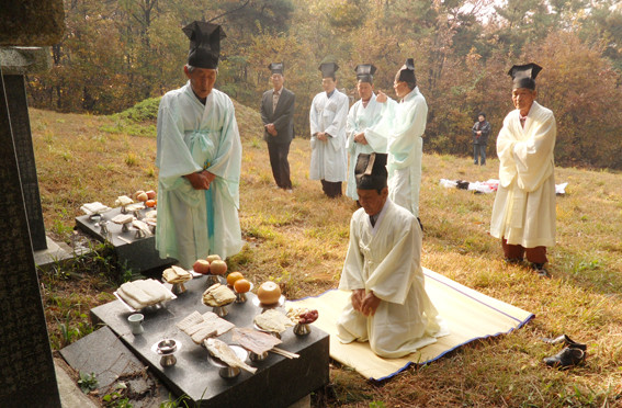 음력10월은 묘사 지내는 달이다 전국어디에서나 흔히 볼 수 있는 광경. 나이 드신 노인들만 행사하는 것이 일반적 현상이다. 첨단산업시대에 어린아이 하나 낳아 기르기도 힘든데 멀리 고향 가서 땅에 절 할 시간이 없다고 하는 젊은이의 말도 이해가 되지만 ‘조상 없는 부모 없고 네가 있고 자식이 있다’는 효의 정신은 아쉽다. 사진은 대창 용전리의 밀양 박 씨 문중노인 10여 명이 11월7일 울음산 대문중 묘사 지내는 모습.
