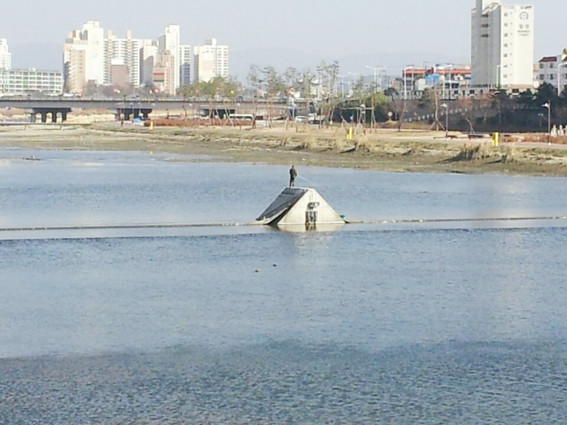 영천교 밑 금호강 물이 빠지자 낚시꾼들이 여기저기서 낚시를 하고 있는데, 지난 21일 오후 한 낚시꾼은 위험스럽게도 고무보 중간 시설물에 올라가 낚시를 하고 있다.