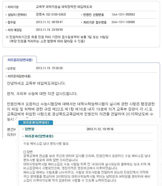 그동안 영천지역 수험생들은 수능예비소집 때 남·여 모든 수험생들이 영천여고 한곳에 모여 수험표를 교부받았다. 이 때문에 수많은 부작용과 불편이 발생하고 수능시험을 하루 앞둔 수험생과 학부모들의 불만이 있어 왔다. 이번 답변은 본지가 지난해에 이어 두 차례나 꾸준하게 문제점을 보도하자 이에 따른 언론 민원의 해결책으로 풀이된다. 경상북도교육청 교육과정과 와 교육부 대입제도과는 각각 이달 12일과 19일 “경북교육에 깊은 관심을 보여주신데 대하여 감사드린다.”는 인사와 함께 “지적한 문제들을 명심해서 2015학년 대학수학능력시험부터는 남학생과 여학생을 분리하여 예비소집이 이루어지도록 하겠다.”며 공식 답변을 보내왔다.