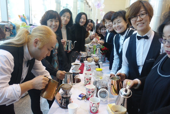 ↑↑ 영천시여성복지회관 하반기 수료식에서 바리스타전문가반이 커피시음을 하고 있다.