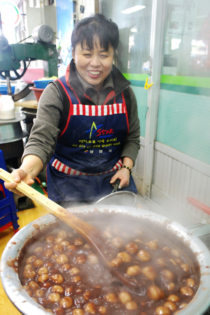 동지를 일주일여 앞둔 영천장날, 영천전통시장 할매죽집 주인 이명희씨가 팥죽을 쑤느라 여념이 없다.