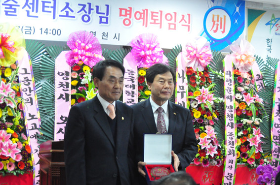 지난 27일 영천농업기술센터 3층 생활과학관에서는 윤광서 소장(사진 우측)의 퇴임식이 열렸다. 김영석 영천시장, 김태옥 시의장을 비롯한 각 기관단체장 축하객 등 200여명 이상이 퇴임축하를 위해 참석했다. 윤 소장은 38년 동안의 공직생활을 마감하고 퇴임을 하면서 녹조근정훈장을 받게 된다.