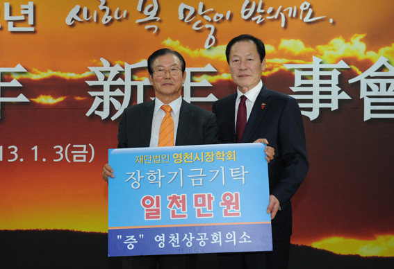 지난 2일 갑오년 새해 영천시청 태권도단에서 123만원, 사)영천시새마을회(회장 고태운)에서 1,500만원, 영천상공회의소(회장 한명동)에서 1,000만원 장학기금을 지역의 교육발전에 써달라며 영천시장학회(이사장 김영석)에 기탁했다.
