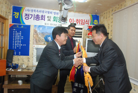 (사)경북옥외광고 영천시지부는 구랍 28일 단포 한 식당에서 2013년 정기총회 및 회장이·취임식을 갖고 2014년 지부를 이끌어갈 새 지부장에 윤영락(디자인벵크)씨를 선출했다. 또 수석부지부장에는 김재휘(믿을광고)씨, 사무국장에는 권영우(대영광고)씨를 각각 임명했다.
