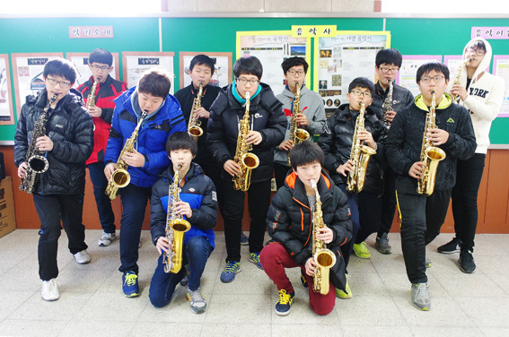 교실에 들어서자 마우스피스에 입술을 고정시킨 학생들의 진지한 표정을 마주할 수 있다. 지도강사 선생님의 지휘가 시작되면 학생들은 색소폰의 옥타브 키를 누르기 시작한다. 모두 알토 색소폰을 들었지만 테너 색소폰처럼 높은 소리를 내는 친구들도 있다. 색소폰 2중창인 것이다. 앞뒤로 좌우로 색소폰을 움직이고 열을 맞춰 행진을 하기도 한다. 열정적인 지도강사 선생님의 눈빛과 아이들의 눈빛이 함께 빛난다.