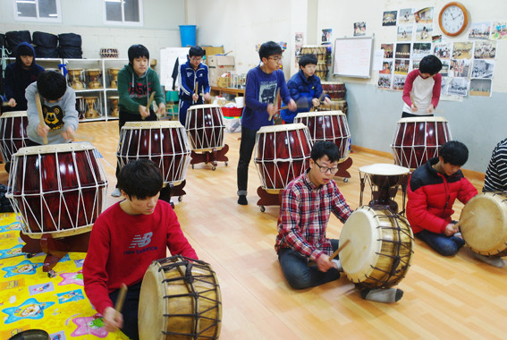 | | | ⓒ 영천시민뉴스 | | 꽹과리, 징, 장구, 북을 중심으로 영천중학교 사물놀이반 학생들이 동그랗게 모여 앉았다. 참소리 사물놀이패(퓨전국악반) 허복선 담당선생님의 신호가 떨어지자 두둥 칭칭 당다닥 악기들이 소리를 내기 시작했다. 방금 전까지 천진난만한 표정으로 친구들과 장난을 치던 학생들의 표정이 연주를 시작하자 마자 진지하고 열띤 표정으로 변했다. 장구를 치는 우성이는 열채를 잡은 손이 보이지 않을 정도로 빠르다. 북을 치는 홍민이도 눈을 감고 머리를 흔들며 연주에 열중하고 있다.
