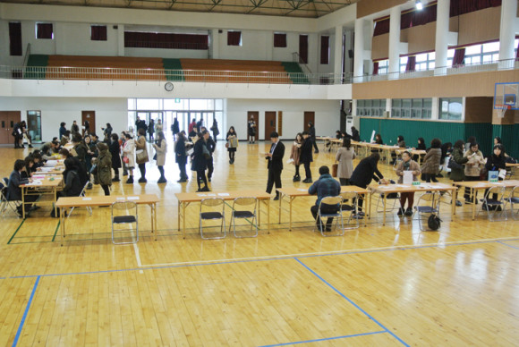 ↑↑ 채용박람회에 강사 희망자들이 줄을 서서 기다리고 있다.