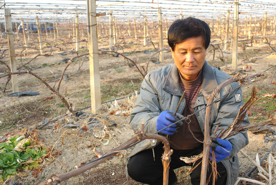 | | | ↑↑ 병해충 방지 위해 포도나무의 껍질을 제거하고 있는 금호 포도밭의 조성현 농부. | | ⓒ 영천시민뉴스 | | 3월은 한 해 농사의 시작을 알리는 신호탄 같은 달이다. 포도, 사과, 복숭아, 배 등의 농사를 짓는 과수농가는 3월 초순이면 어김없이 전정(가지치기)을 시작한다. 금호 오계리에서 포도농사를 짓는 조성현(57)씨도 일주일 전에 벌써 전정을 마쳤다. 지금은 병해충을 없애기 위한 나무껍질 제거작업이 한창이다.