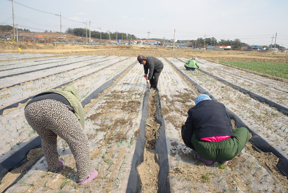 밭에는 한 해 농사를 시작하는 농부들의 작업이 한창이다. 비닐피복을 다시 입히고, 풀을 뽑고, 흙뿌림을 하는 본격적인 농사가 시작된 것이다. 그렇게 하루를 꼬박 들녘에 앉아 작업에 몰두하는 농부들의 손길은 마냥 바쁘기만 하다.