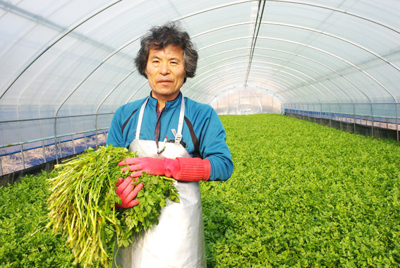 “매년 9월초에 씨를 뿌리고 겨울에는 하우스를 열어 온도를 영하로 떨어뜨린 상태에서 동면을 시킵니다. 동면을 안 하면 미나리 마디가 생기지 않고 잎만 무성해지거든요. 12월 초까지 동면이 끝나면 줄기가 다시 자라도록 하우스를 닫고 온도를 높입니다. 그때부터는 온도가 관건입니다. 하우스관리를 잘 해야 하지요. 지하수를 미나리 밭에 계속 흘려주는데 지하수의 온도가 18도 정도를 유지하고 있으니 지하수를 흘리는 것이 온도를 높이것과 같은 결과과를 낳게 됩니다. 그러니 지하수가 시작되는 곳은 물의 온도가 높아 빨리 자라고 하우스 저 끄트머리의 미나리는 더디 자라는 것이지요. 빨리 자라는 쪽부터 베어서 합니다. 저 끝의 미나리까지 3월 말이면 모두 판매가 되겠지요. 다른 농사와는 달리 미나리는 3월이 농사의 마무리 달인 셈입니다.”