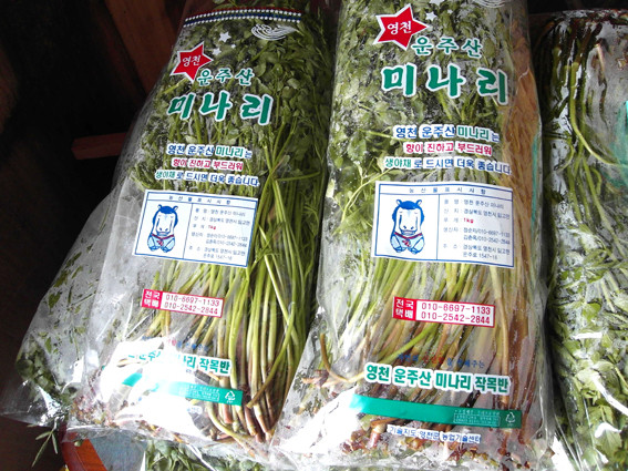 ↑↑ 아주머니들이 미나리를 손질하고 있다.