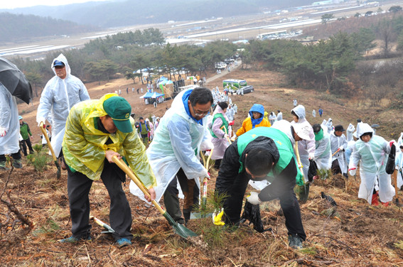 푸른 영천을 만들기 위해 우천에도 불구하고 지역의 각 기관·단체들은 물론 경북도와 도민들이 한자리에 모였다. 영천시는 지난 20일 고경면 도암리 야산에서 도민과 함께하는 나무심기 행사를 개최했다. 사진은 나무심기 행사에 참석한 시민들이 나무를 심고 있는 모습.